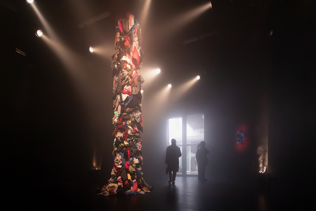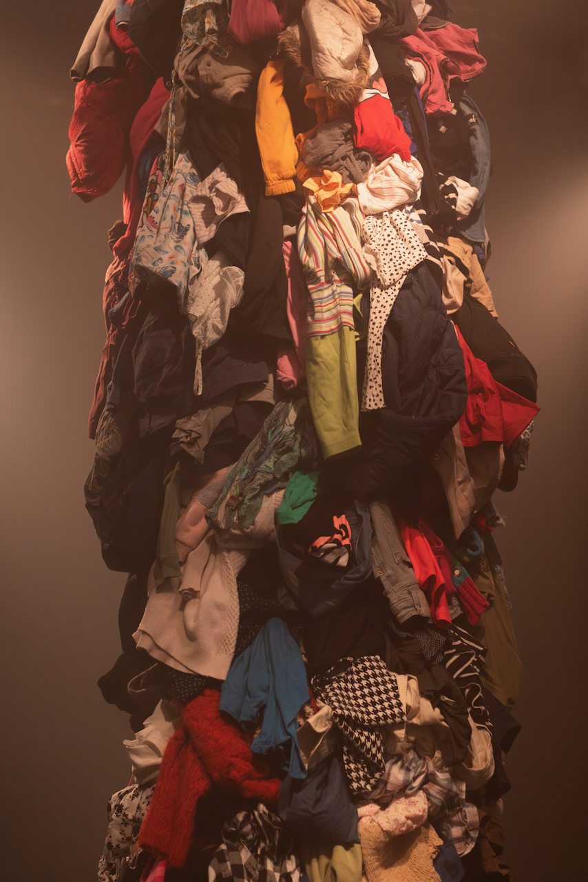 Coluna de roupas erguida como memorial de corpos, carregando nas fibras as marcas de presenças passadas. A obra reúne peças descartadas em lixos urbanos e coletadas pelo artista ao longo de seis meses, condensando ausências, histórias e rastros deixados no tecido da vida cotidiana, mas também evidenciando o impacto ambiental do descarte têxtil, hoje reconhecido como um dos maiores agentes poluidores do planeta.